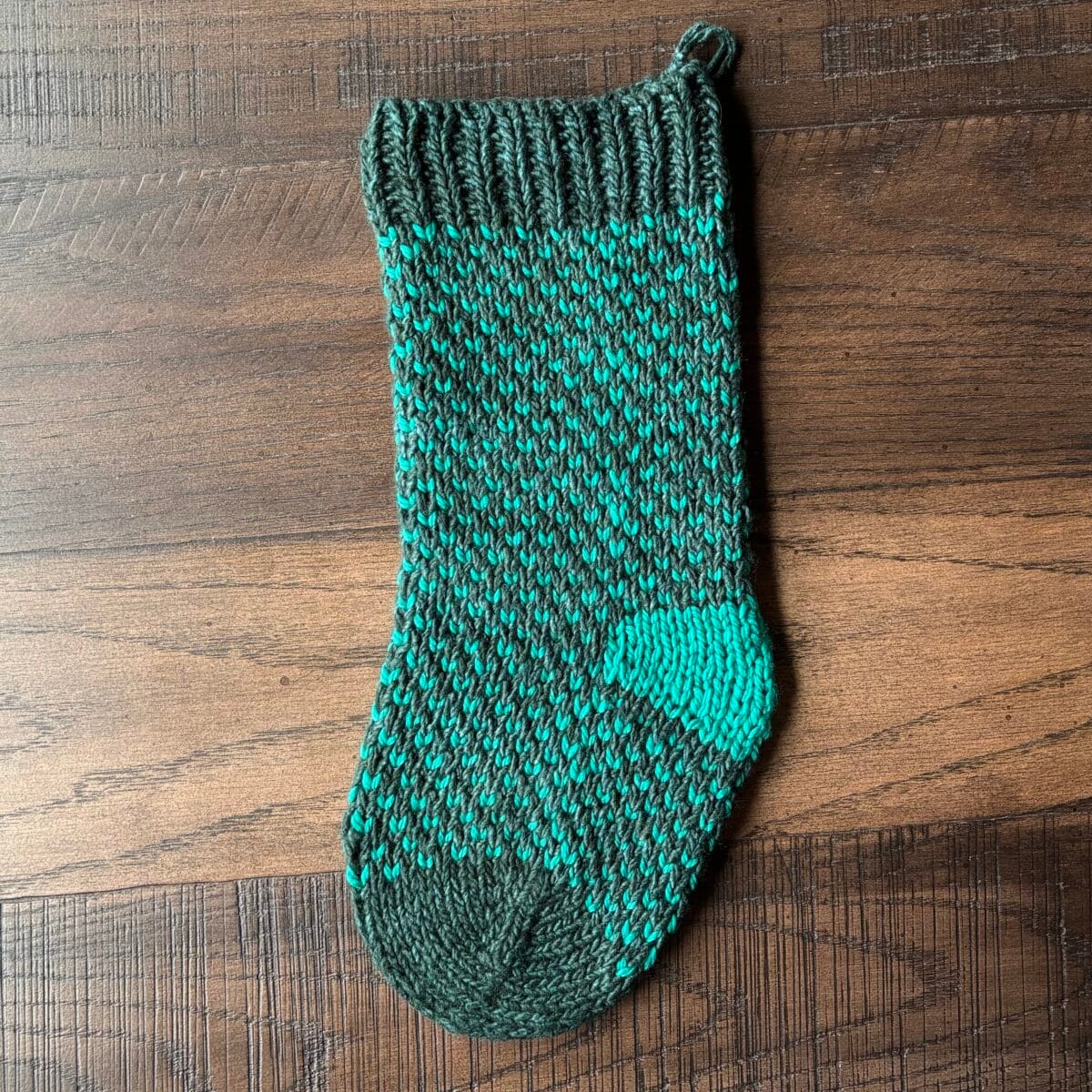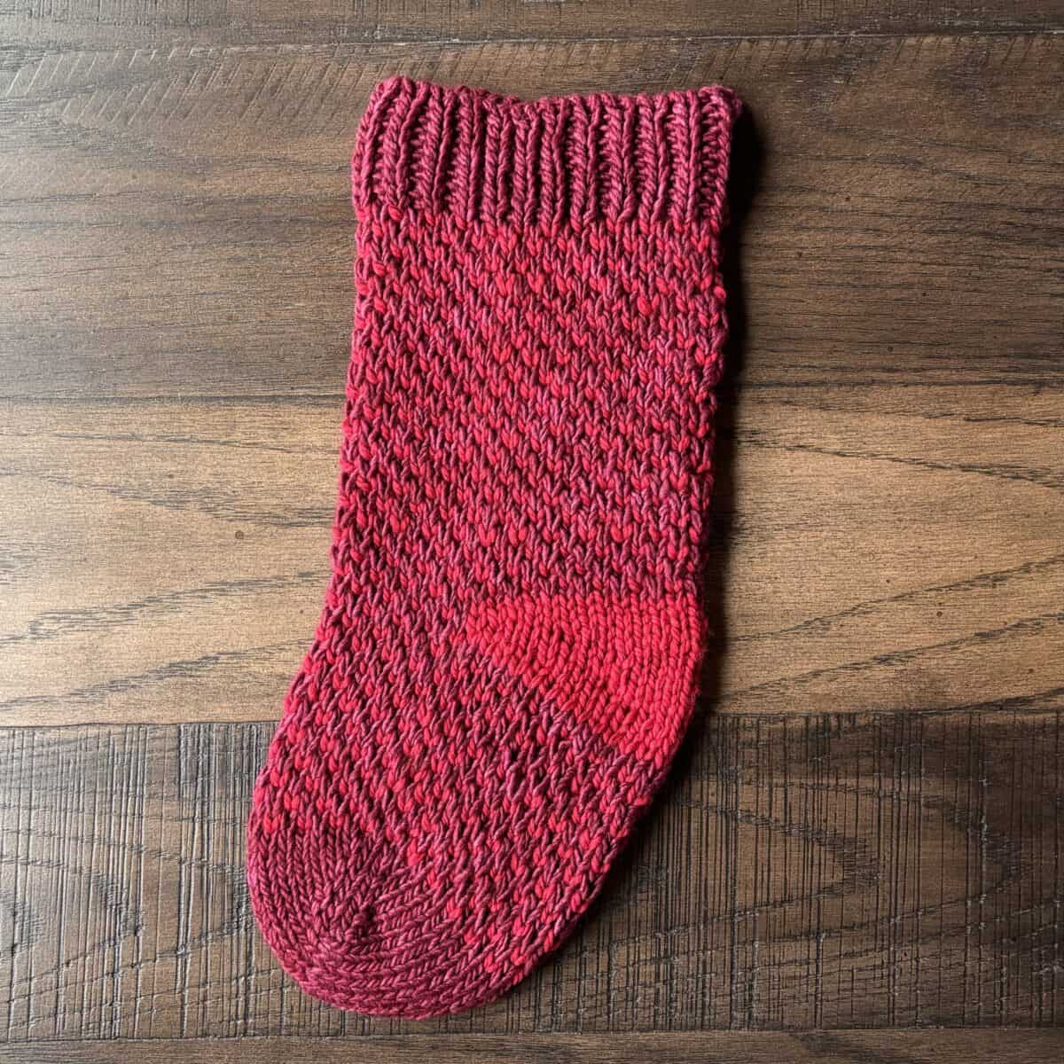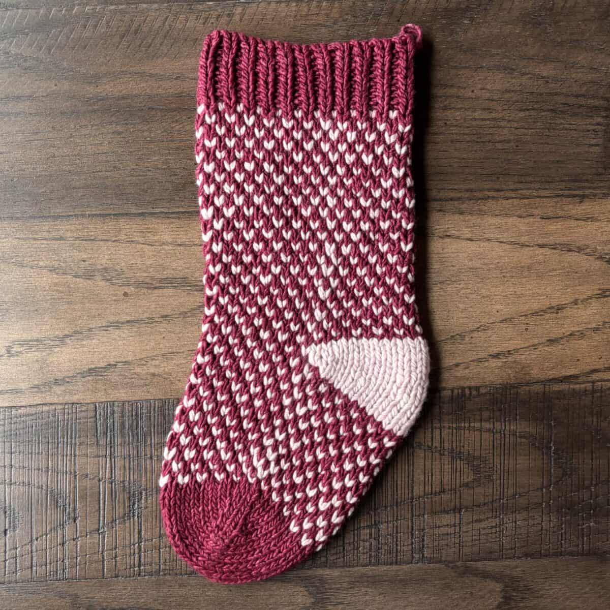 Note: Matching gauge is optional as this stocking is a home accessory that doesn’t need to fit anyone. However, a different gauge does mean different yardage requirements and different drape. More stitches per inch will result in a stocking that holds its shape, fewer stitches per inch will result in a stocking that drapes loosely.
